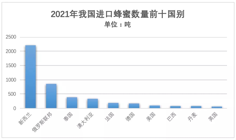 Among them, China imported the most honey, up to 4809.45 tons, accounting for 93.5% of the total imported bee products in China, and the import amount also accounted for 93.1% of the total import amount. From the data of imported honey for three consecutive years, it can be seen that the amount of imported honey in China has not been affected by the epidemic in these two years and has maintained a continuous growth for three consecutive years. Especially in 2020, although the amount of imported honey has decreased, the amount of imported honey has not decreased but increased. Followed by beeswax, imported 287.93 tons, accounting for 5.6% of China's total import; Other bee products ranked third, with 38.9 tons of imported quantity, accounting for 0.76% of the total. Imports of fresh royal jelly, royal jelly preparations, royal jelly freeze-dried powder and bee pollen were small, with a total import of 5.71 tons.