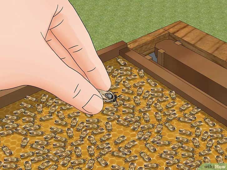 4. Keep the queen bee above the hive at all times. If the queen bee falls accidentally, don't let it fall on grass or beekeeping equipment, it should fall back into the hive. So when you're done marking the queen bee, keep it above the hive at all times.